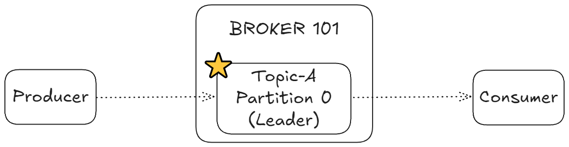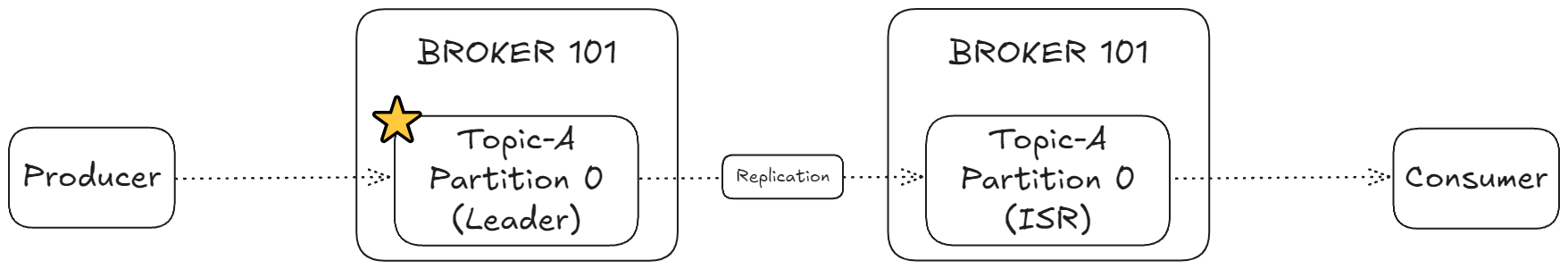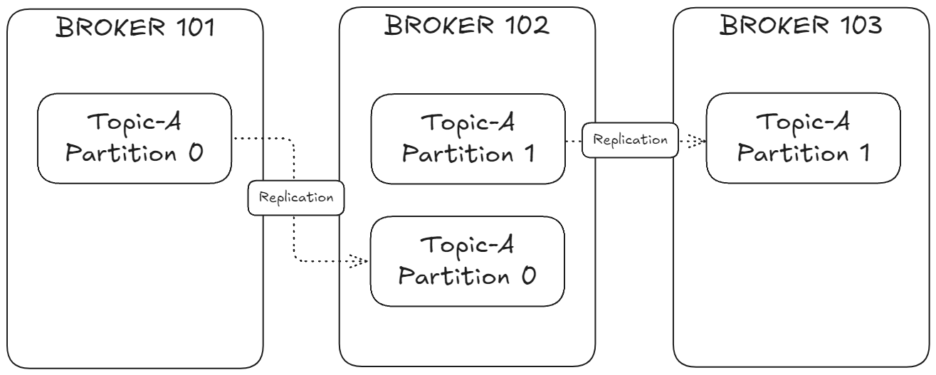 - 파티션 0: 브로커 101에 저장(리더), 브로커 102에 복제(팔로워)
