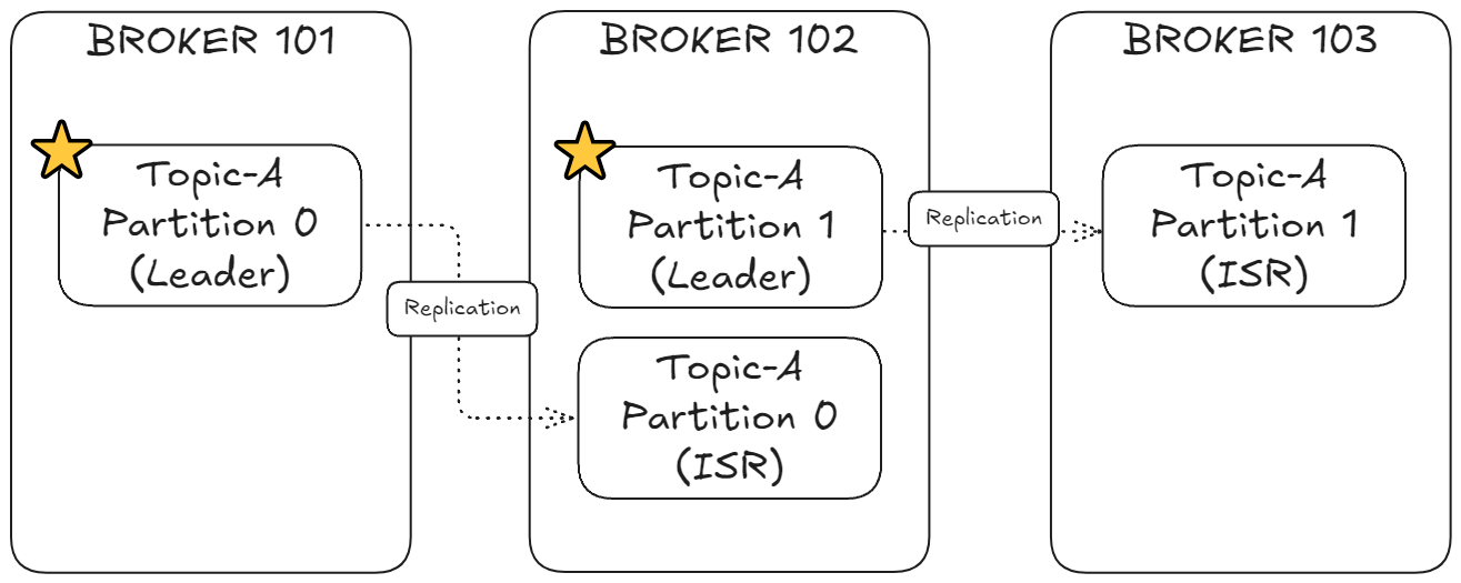 - 파티션 1: 브로커 102에 저장(리더), 브로커 103에 복제(팔로워)