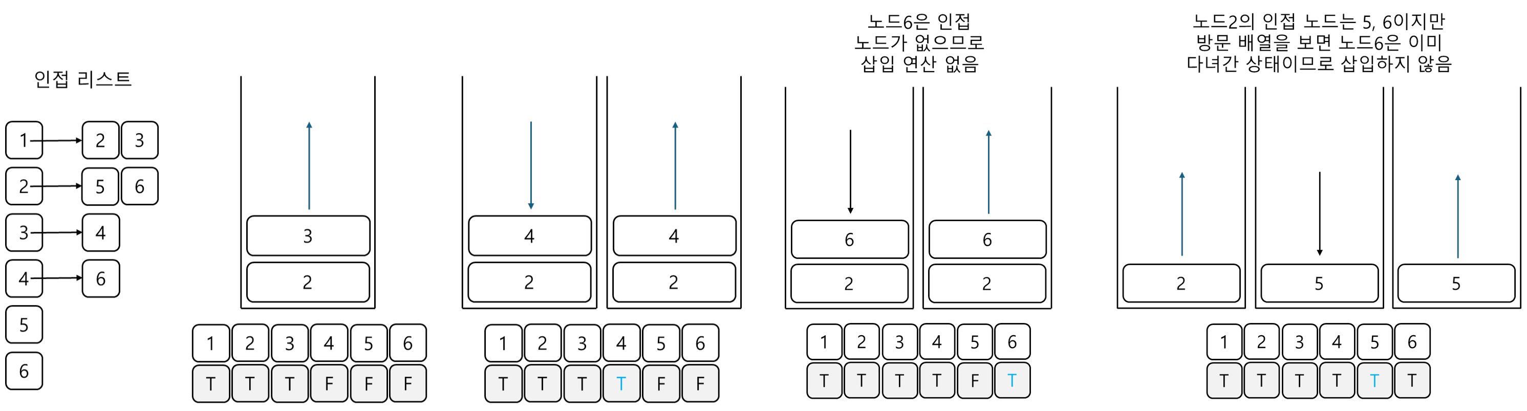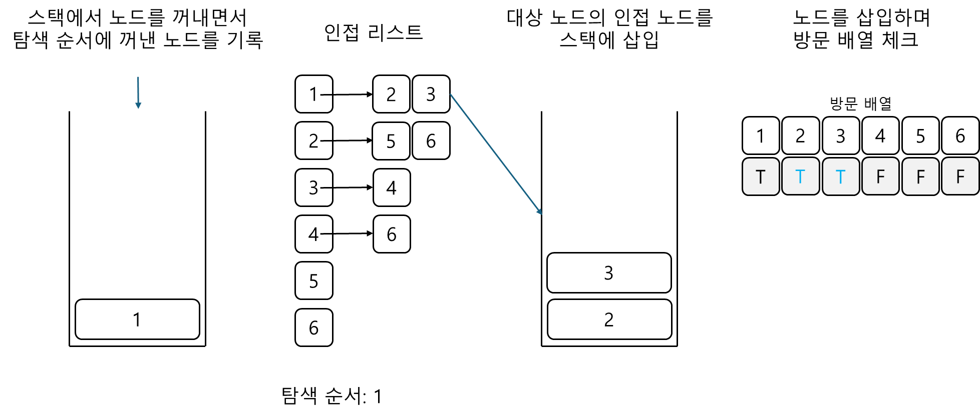 이제 pop을 수행하여 노드를 꺼낸다. 꺼낸 노드를 탐색 순서에 기입하고 인접 리스트의 인접 노드를 스택에 삽입하여 방문 배열을 체크한다. 방문 배열은 T, T, T, F, F, F가 된다.