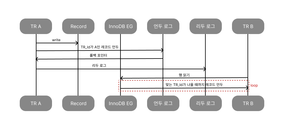 - 변경된 트랜잭션이 아직 커밋되지 않은 경우, 요청한 트랜잭션이 볼 수 있는 트랜잭션 id에 도달할 때까지 언두 로그 레코드를 추적해서 적용함