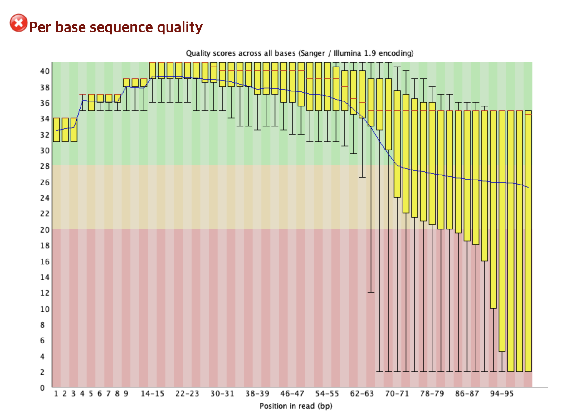 해당 지표는 QC에서 가장 중요한 부분 중 하나이며, 각 위치에서의 Phred 품질 점수의 분포를 박스 플롯으로 설명하고 있다.