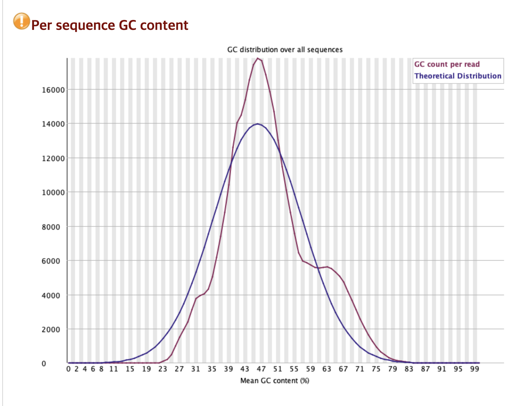 이 그래프는 Read들의 평균 GC함량 분포를 나타낸다. 빨간 선이 실제 데이터 분포이고, 파란 선은 컴퓨터가 계산한 이상적인 정규 분포 모양이다.