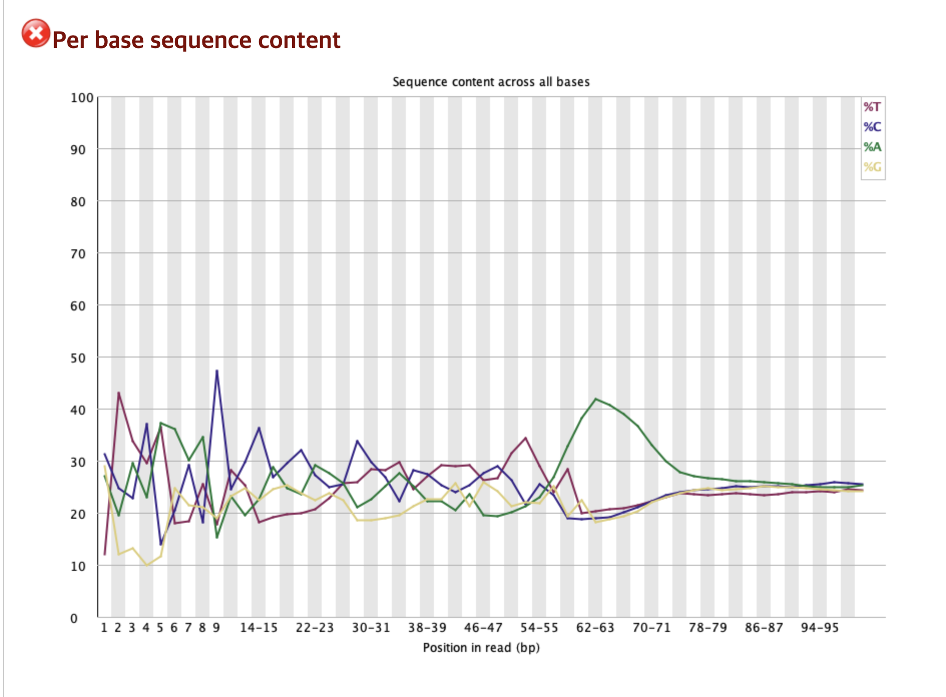 초반부의 심한 편향(1 ~ 15bp) 에 의해 해당 그래프의 초반부의 요동이 심한 것을 볼 수 있다. 이는 시퀀싱 초반 염기 서열이 특정 염기들로 쏠려있다는 염기 구성 편향(sequence bias) 가 있다는 강력한 증거이다.