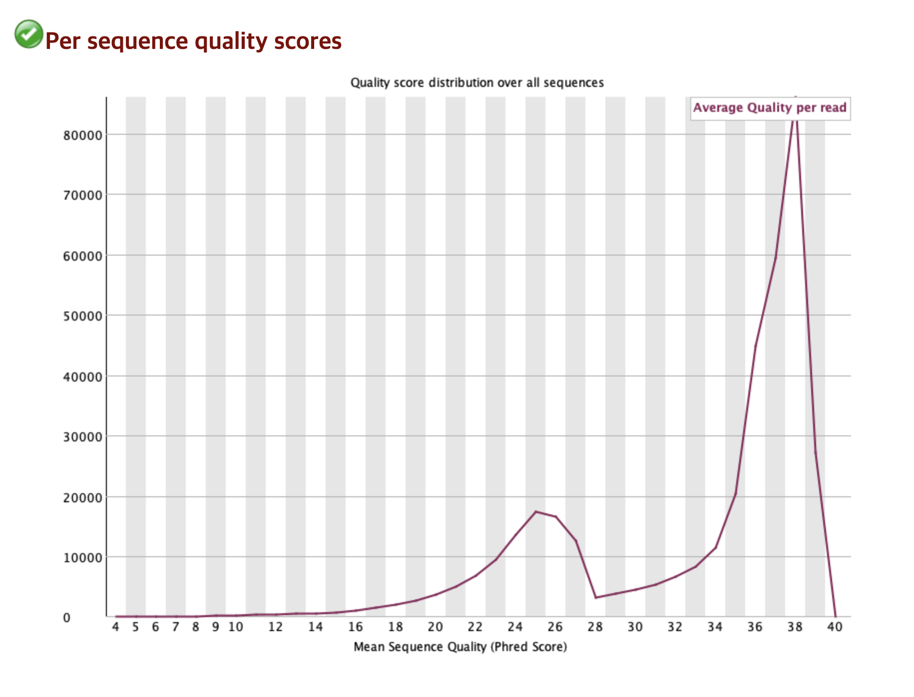 해당 지표는 개별 Read의 평균 품질 점수 분포를 보여준다. 데이터의 전반적으로 품질이 좋음을 알 수 있다.