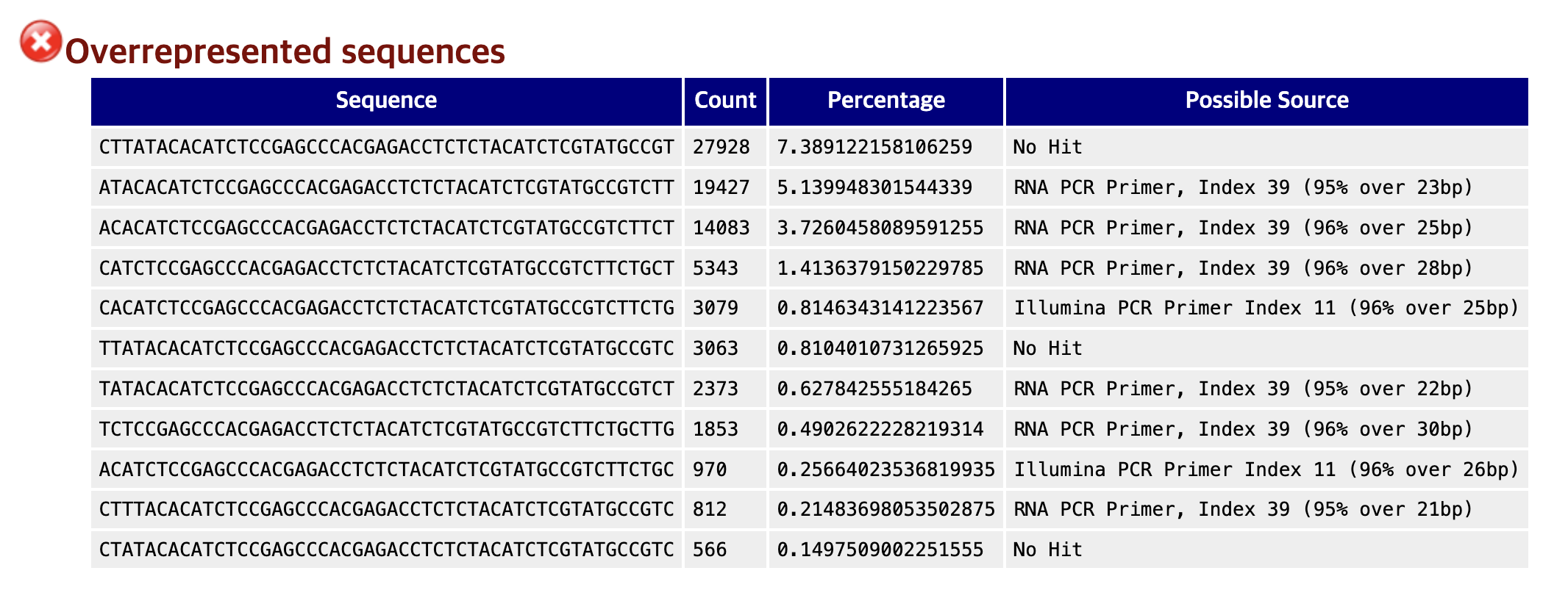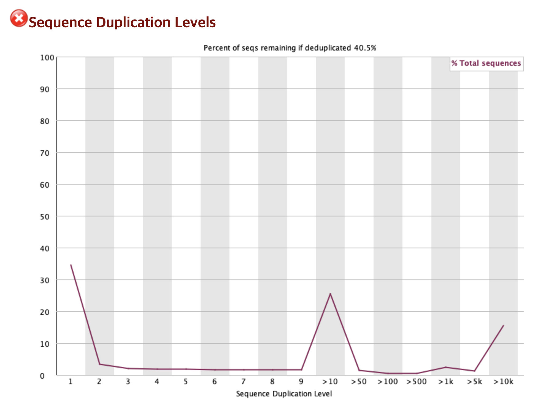 이 항목은 ❌ 가 표시되었지만 RNA-Seq 데이터에서는 지극히 정상적인 결과일 수 있기 때문에 해석에 주의가 필요하다.
