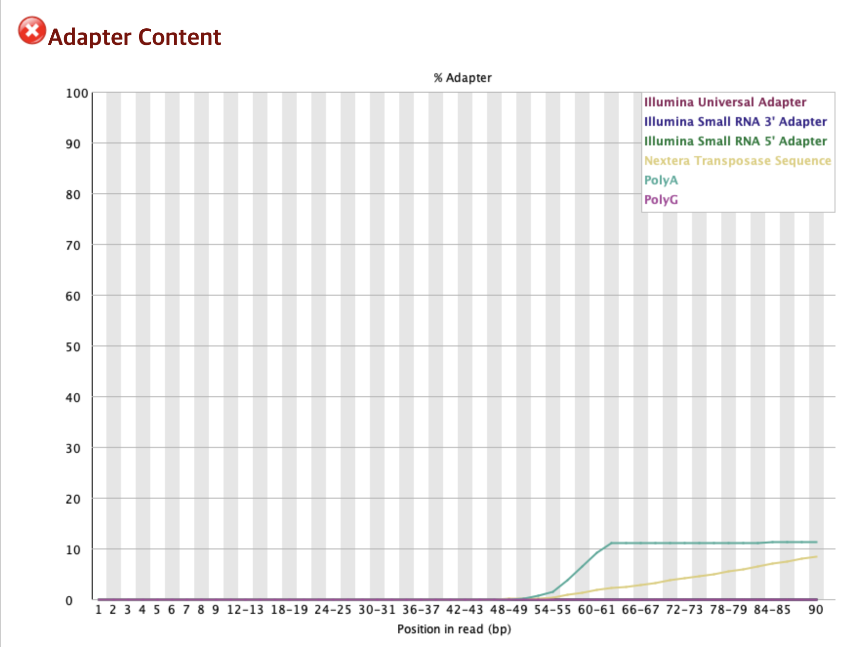 그래프를 보면 Read의 뒷부분(약 55bp 이후)으로 갈수록 어댑터 서열의 비율이 급격하게 증가하는 것을 볼 수 있다.