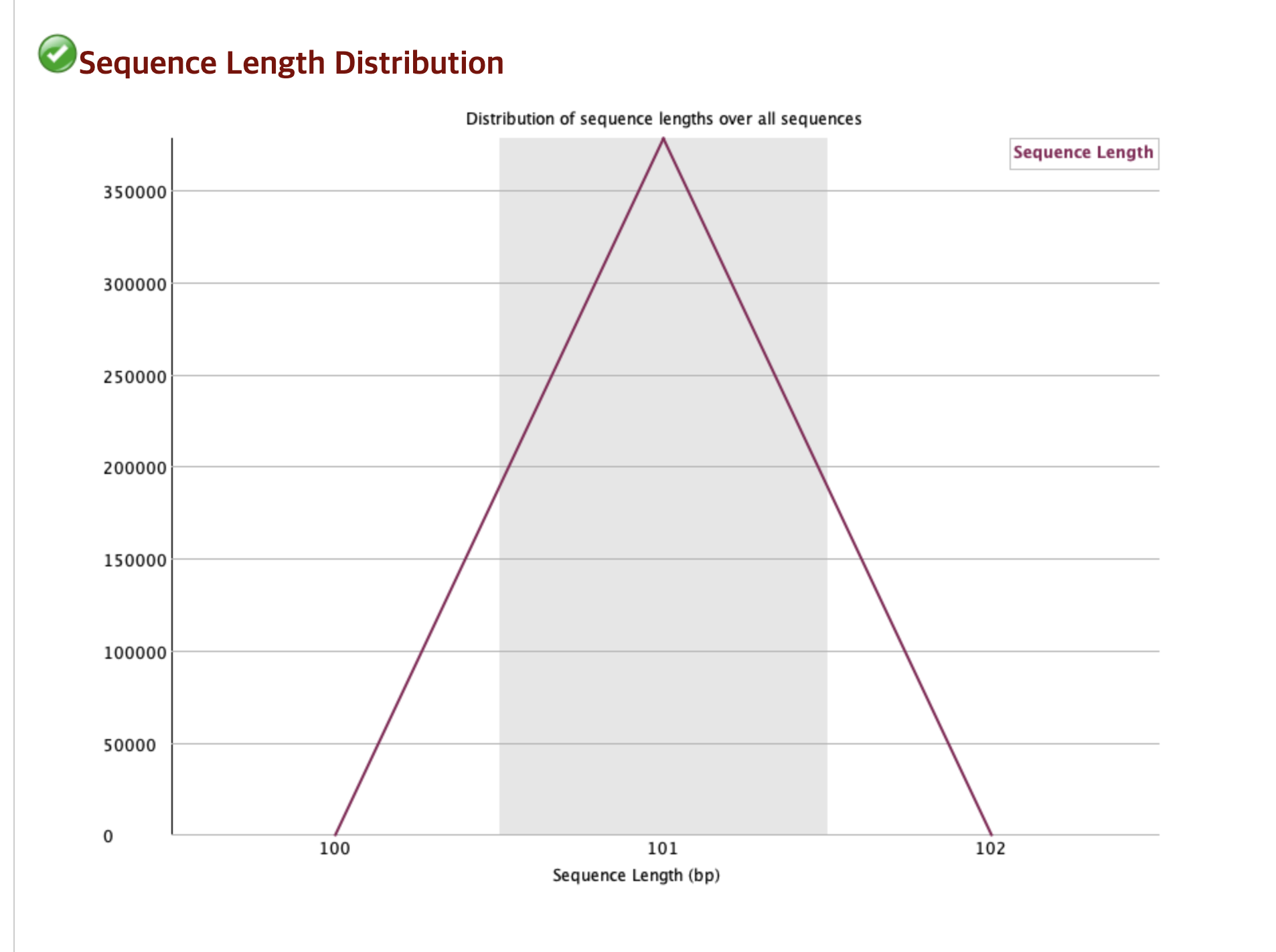 서열 길이 분포를 나타내며, 해당 데이터의 모든 Read의 길이가 101bp로 동일하다는 좋은 결과를 나타낸다.