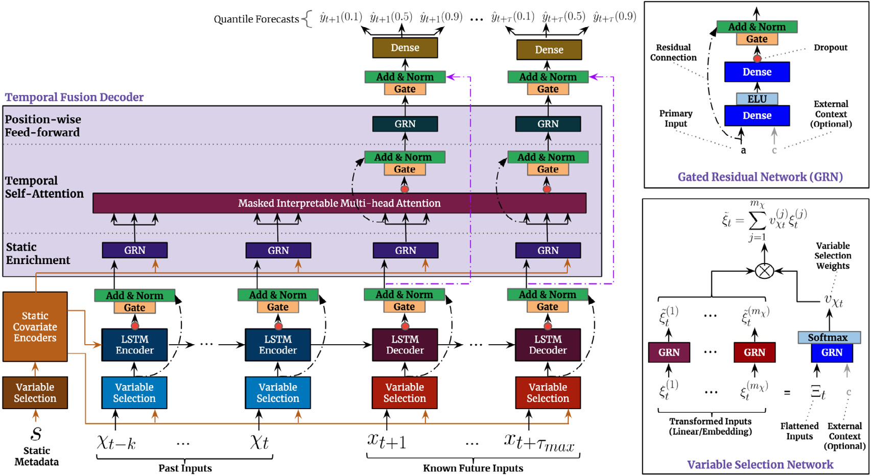 현재 Forecasting분야의 SOTA(State of the art) 모델인 Temporal Fusion Transformer모델은 Transformer의 Attention 메커니즘을 도입하여 장기 의존성(Long-term dependency)을 포착하고, 다양한 형태의 변수를 처리할 수 있다.