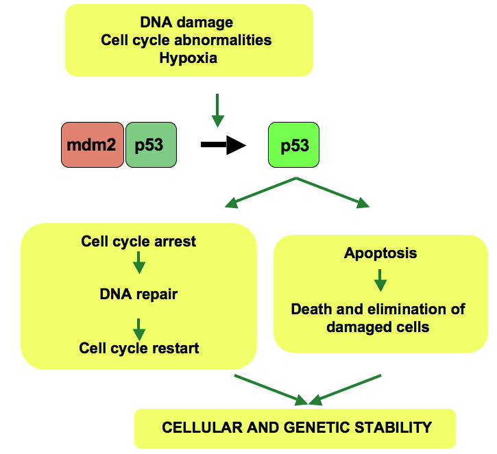 정상 세포에서 p53은 음성조절자 mdm2 에 의해 불활성화 된다. 그러나 DNA손상이나 다른 스트레스가 있을시 다양한 경로들이 p53과 mdm2를 분리시켜 활성화 된다. p53은 세포주기를 멈추게 하고 손상을 고치거나, 세포를 없앨 것을 결정하는데 어떤 원리로 p53이 결정을 내리는지는 아직 알 수 없다.