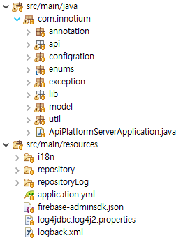 java디렉토리에는 annotation, api, configuration, enums, exception, lib, model, util 디렉토리로 구분되어 있습니다.