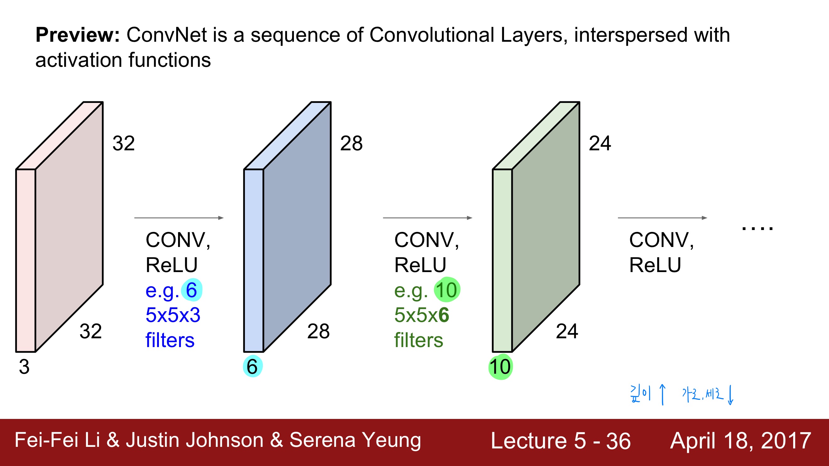 그림을 설명하면 다음과 같다. 32x32x3의 입력 이미지를 6개의 5x5x3(입력 이미지의 depth가 3이므로 필터의 depth도 3)의 필터로 내적하여 28x28x6(필터의 개수가 6개이므로 depth가 6)의 activation map을 얻는다. 28x28x6의 activation map은 입력 이미지가 되어 10개의 5x5x6(입력 이미지의 depth가 6이므로 필터의 depth도 6)의 필터와 내적을 하고 24x24x10(필터의 개수가 10개이므로 depth가 10)의 activation map을 얻는다. 이 과정이 계속 반복된다.