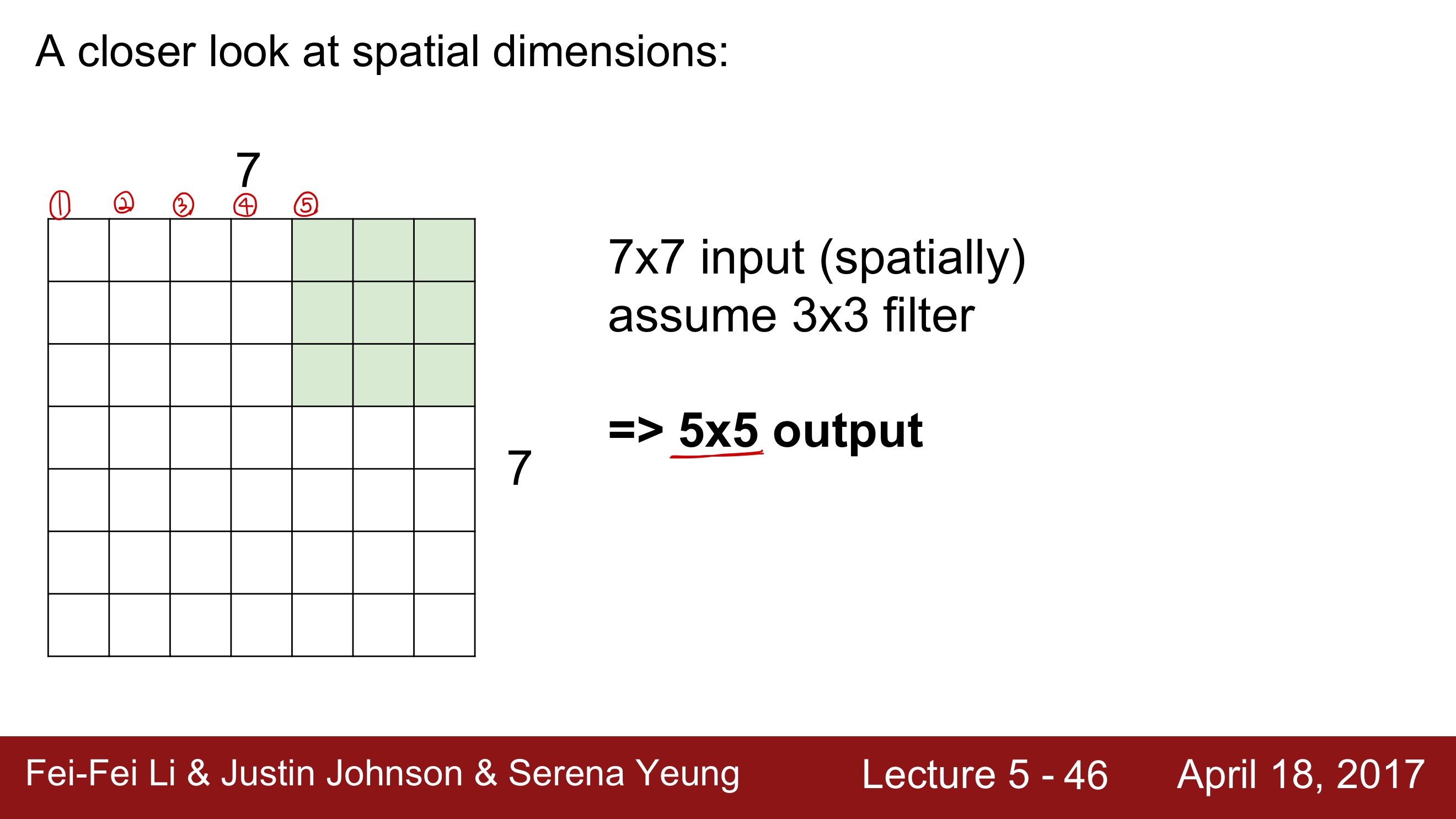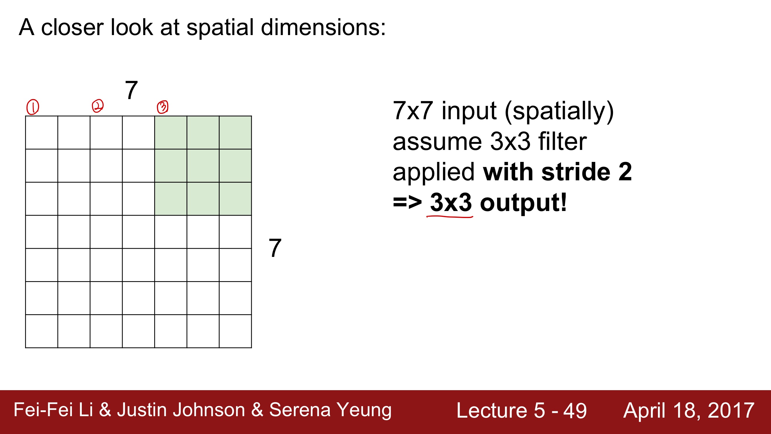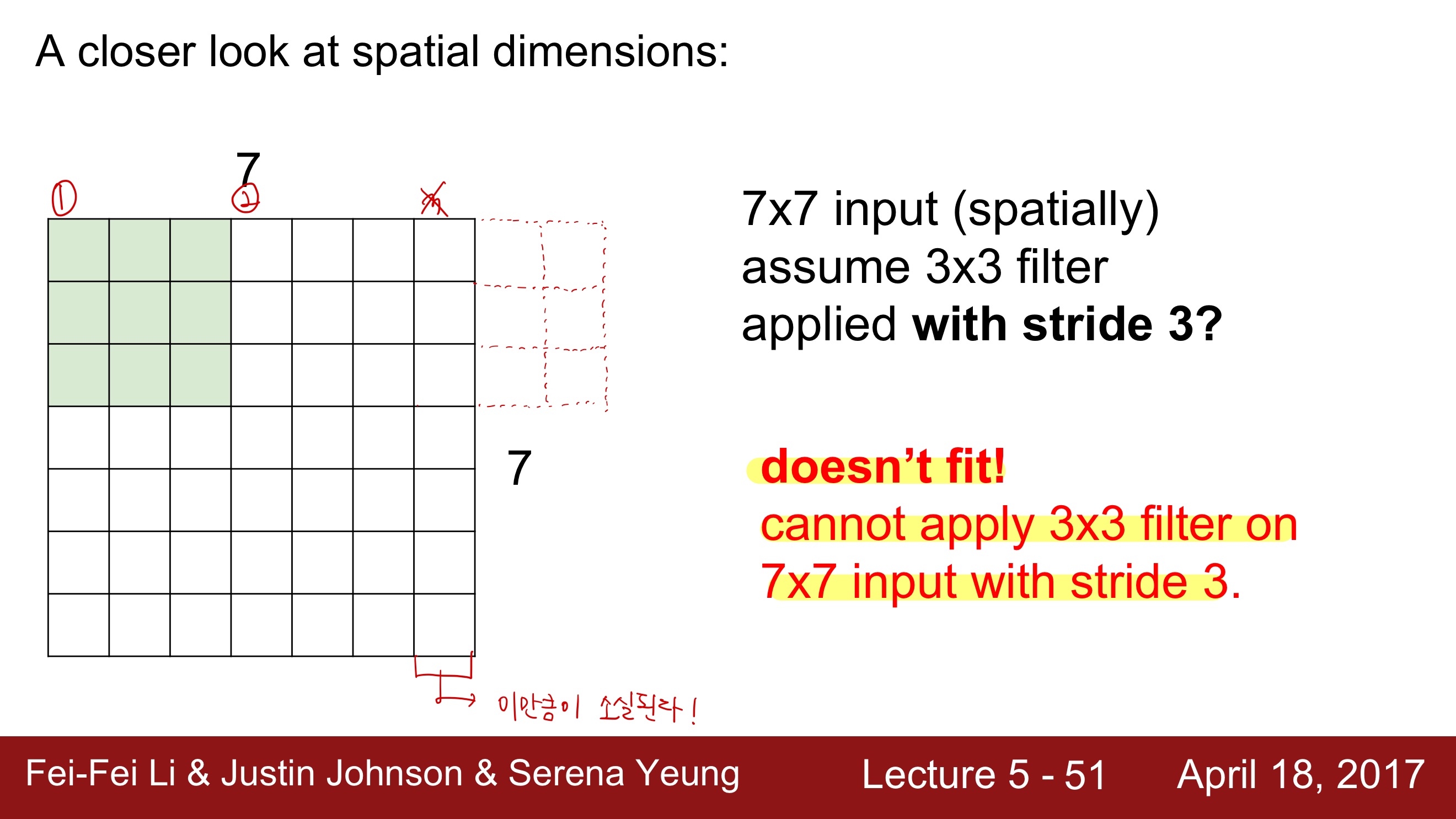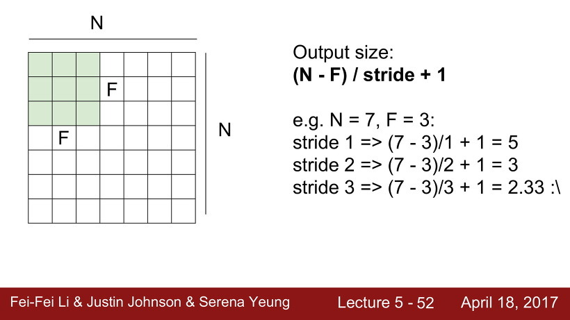 여기서 주의해야 할 점은, 일반적으로 stride는 filter끼리 서로 겹치는 것은 지양해야 한다는 것이다. 가령, 위의 stride가 1이라면, 빨간 부분과 초록 부분 사이에 걸치는 부분이 생기게 되는데, 이러면 조금 곤란해진다.