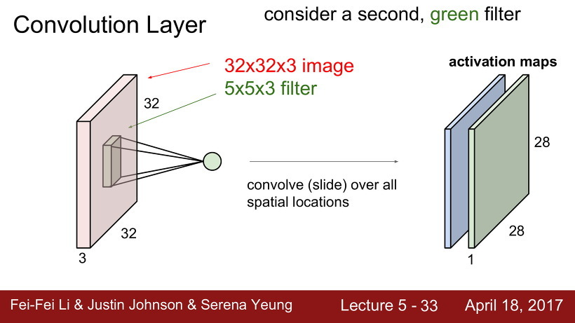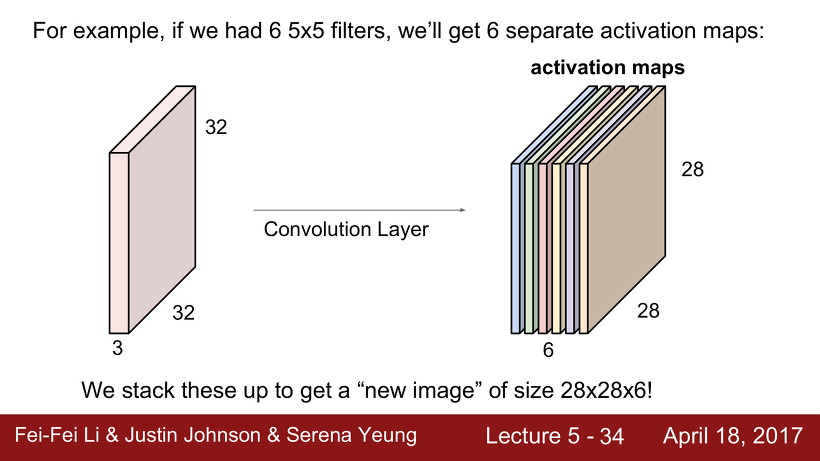 예를들어, 6개의 filter를 사용한다면 6개의 activation map이 나온다. 그렇게 나온 6개의 activation map을 모아 크기 28 x 28 x 6의 새 이미지를 얻을 수 있다.