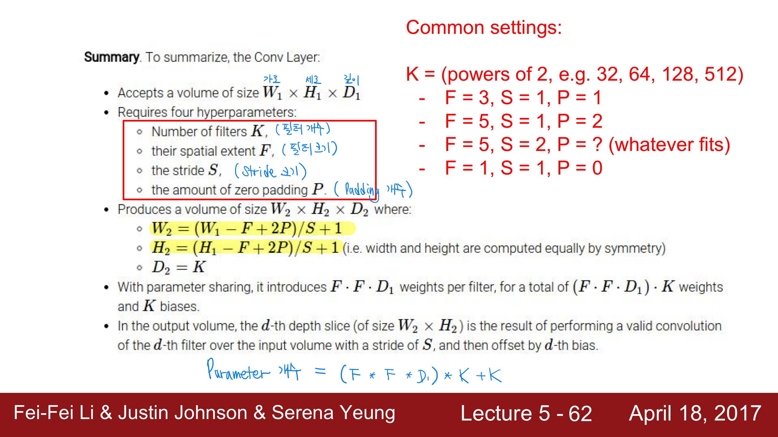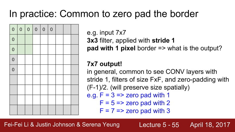일반적인 경우엔 convolutional layer은 stride는 1로 하고, filter 크기가 F X F라면 padding은 (F-1)/2의 크기만큼 한다고 한다.