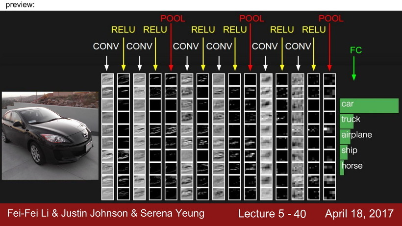 CNN에서는 입력 이미지가 convolution layer와 활성함수 ReLU를 통과하여 activation map을 얻고, 앞에서 얻은 activation map에 다시 convolution layer와 활성함수 ReLU를 통과하여 다시 activation map을 얻는 과정을 반복적으로 하게 된다. (ConvNet은 activation map이 흩어져 있는 Convolution Layers의 배열이다.)
