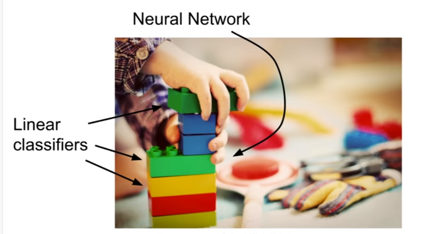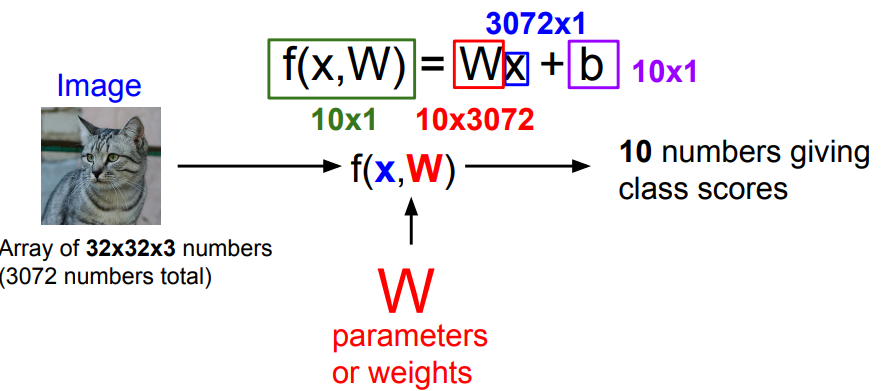 총 개수 가로픽셀수 x 세로픽셀수 x 채널수(컬러면 RGB로 3, 흑백은 1)로 이루어진 데이터들을 행렬계산을 위해 벡터로 쫙 펼치고, 각 클래스를 대변할 수 있는 parameter인 W(가중치, weights)와 b를 설정하여 결괏값을 구해 가장 score가 높은 class로 분류하게 된다. 여기서 사용되는 함수 f(x, W)가 직선의 방정식이라서 linear classifier라고 부른다.