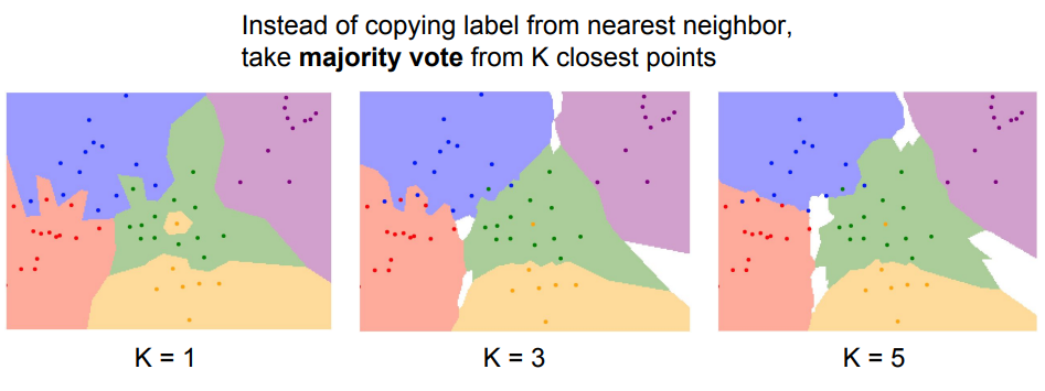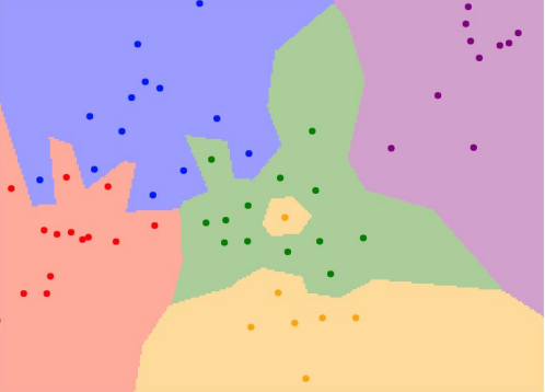 : K=1의 경우 학습데이터자체는 완벽히 분류하게 되지만, 새로운 데이터로 test해보면 튀는 데이터로 인한 복잡한 분류로 인해 오히려 성능이 떨어지게 된다.