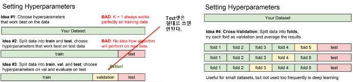 : validation set를 따로 설정하는 것이 의미가 없을정도로 데이터가 부족한 경우, train set를 K개의 fold로 나누어 돌아가면서 validation set 역할을 한다. 이를 K-교차검증이라고 한다.
