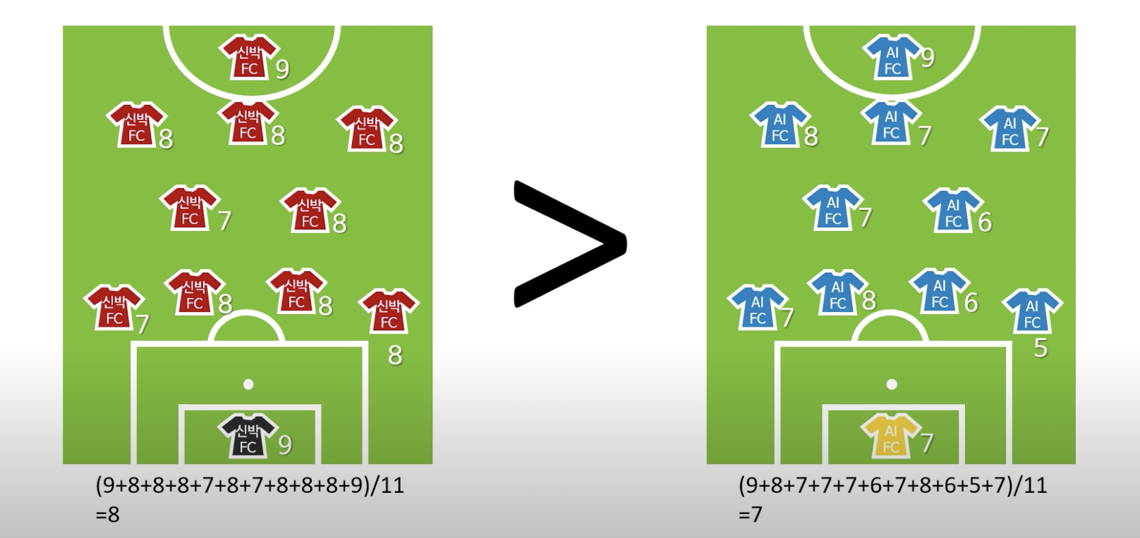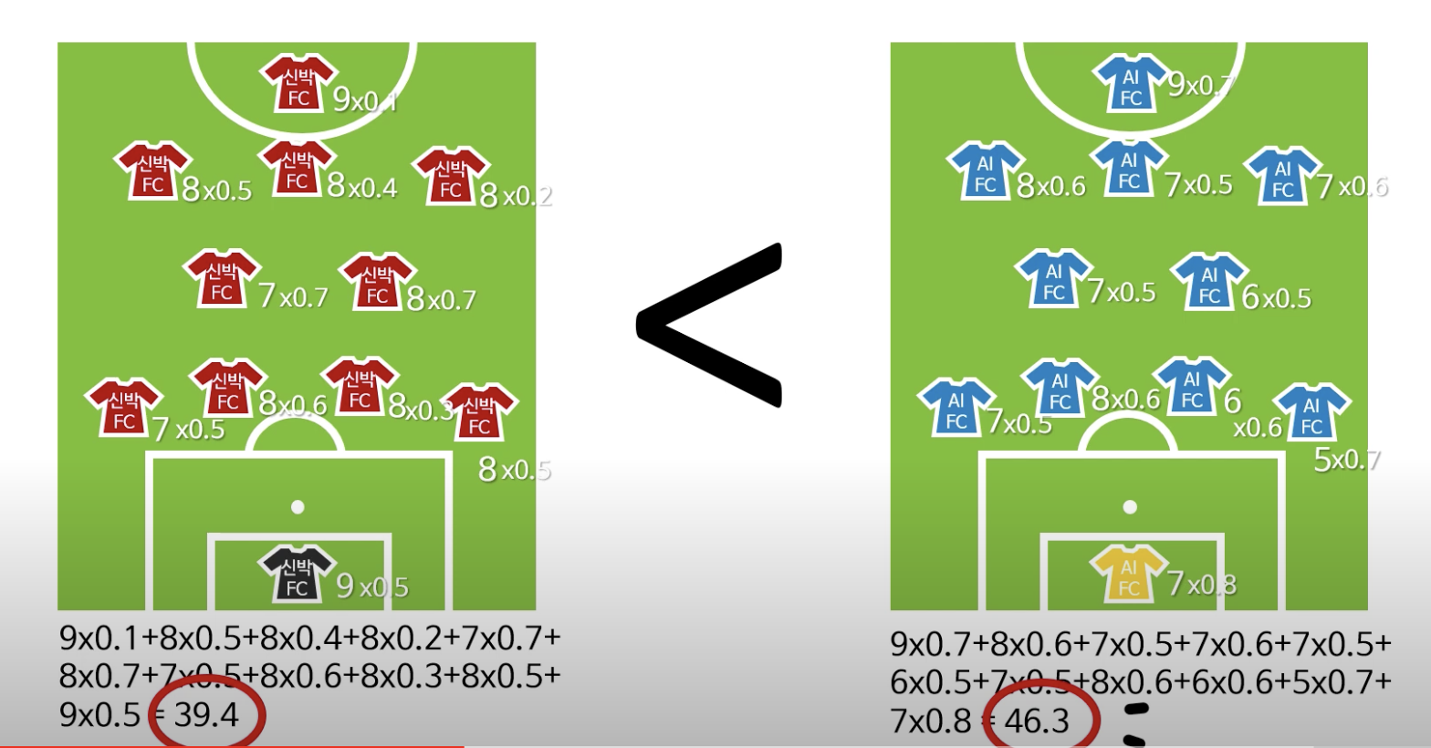컨디션에 따라 제 기량을 100% 발휘하지 못하는 경우도 있기 때문에 각각의 기량에 제 기량을 발휘할 확률을 곱해보면 AI FC의 값이 더 큰 것을 확인할 수 있다.
