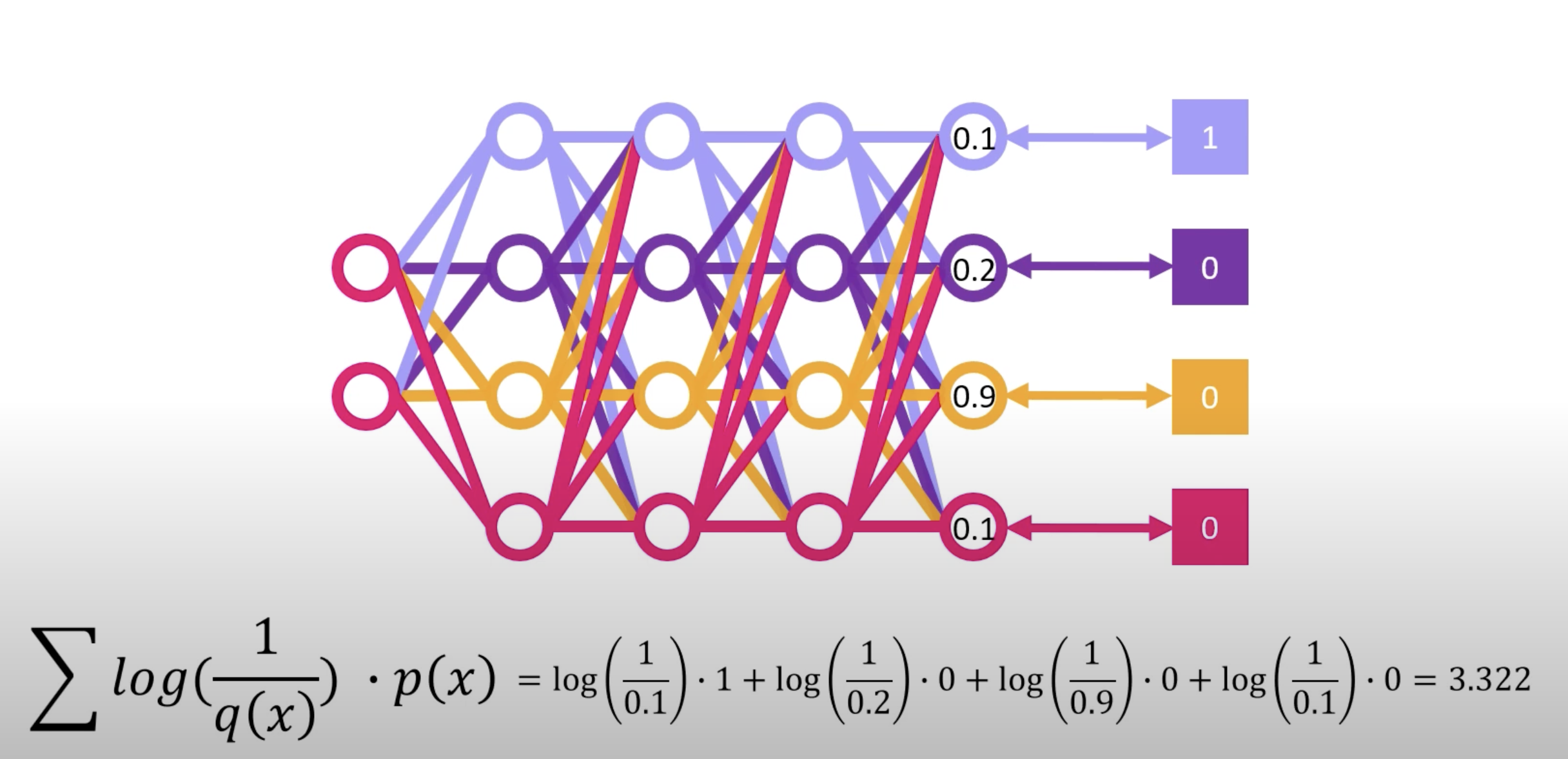 크로스 엔트로피 공식을 통해 다음과 같이 loss를 계산할 수 있고, 이 loss가 작아지는 방향으로 가중치를 업데이트하게 된다.