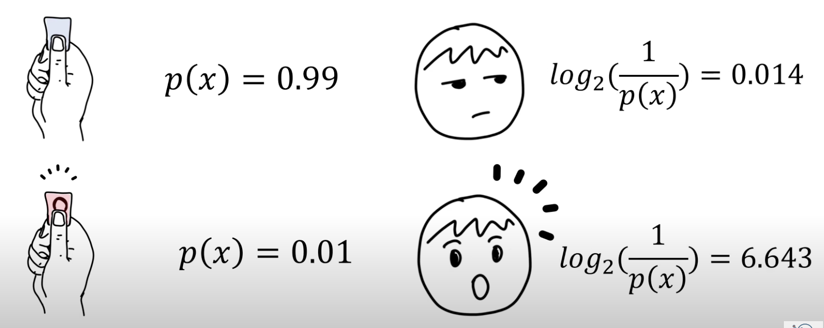 이때, 사람들은 파란 종이를 뽑으면 시큰둥하겠지만, 빨간 종이를 뽑는다면 매우 놀랄 것이다. 즉, 확률이 높으면 그 사건이 발생해도 별로 놀라지 않고, 확률이 낮으면 그 사건이 발생했을 때 많이 놀라게 된다.
