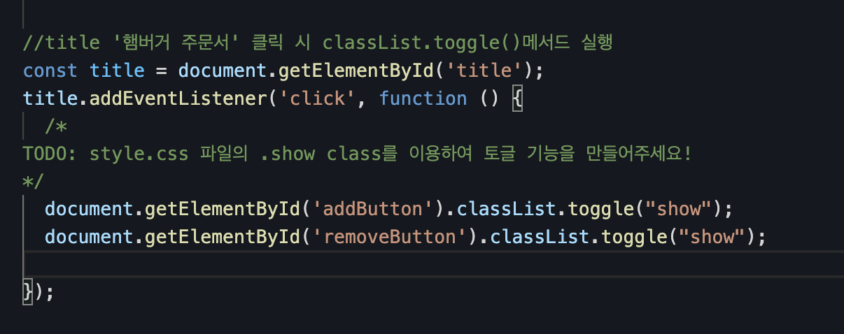 처음에는 button class를 사용해서 하면 되겠지? 하고 document.getElementsByClassName('button').classList.toggle("show");로 자동완성도 안되는 걸 꾸역꾸역 적었는데 막상 적어놓고 보니 토글이 안됨.