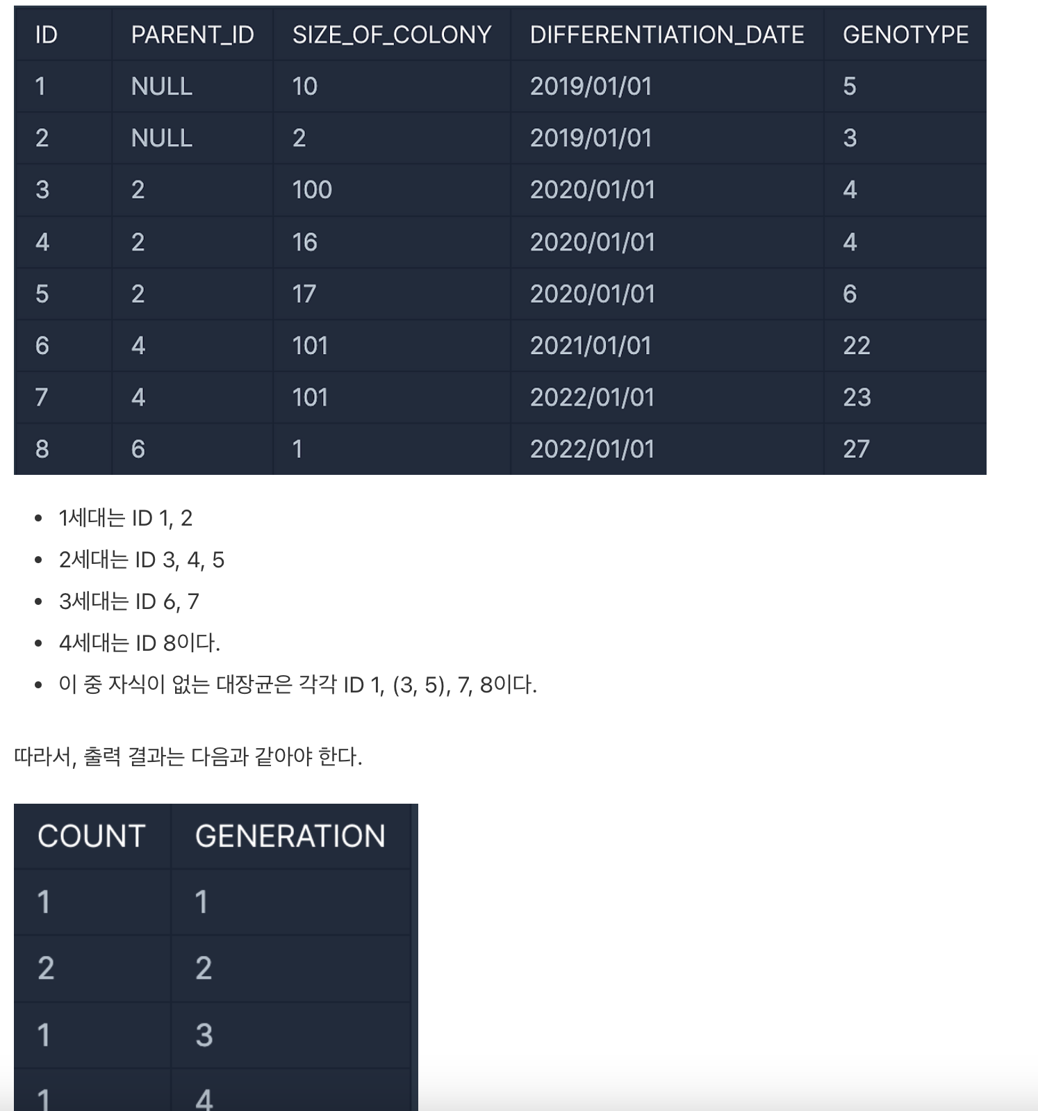 대장균들은 일정 주기로 분화하며, 분화를 시작한 개체를 부모 개체, 분화되어 나온 개체를 자식 개체라고 한다. 이 문제는 각 세대별로 자식이 없는 대장균 개체의 수를 구하고, 세대별로 오름차순으로 출력하는 것이다.