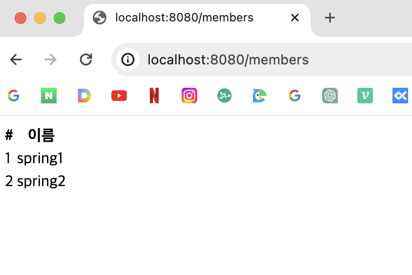 회원 가입에서 'spring1', 'spring2'를 등록해주고 회원 목록을 들어가보면 다음과 같이 나온다.