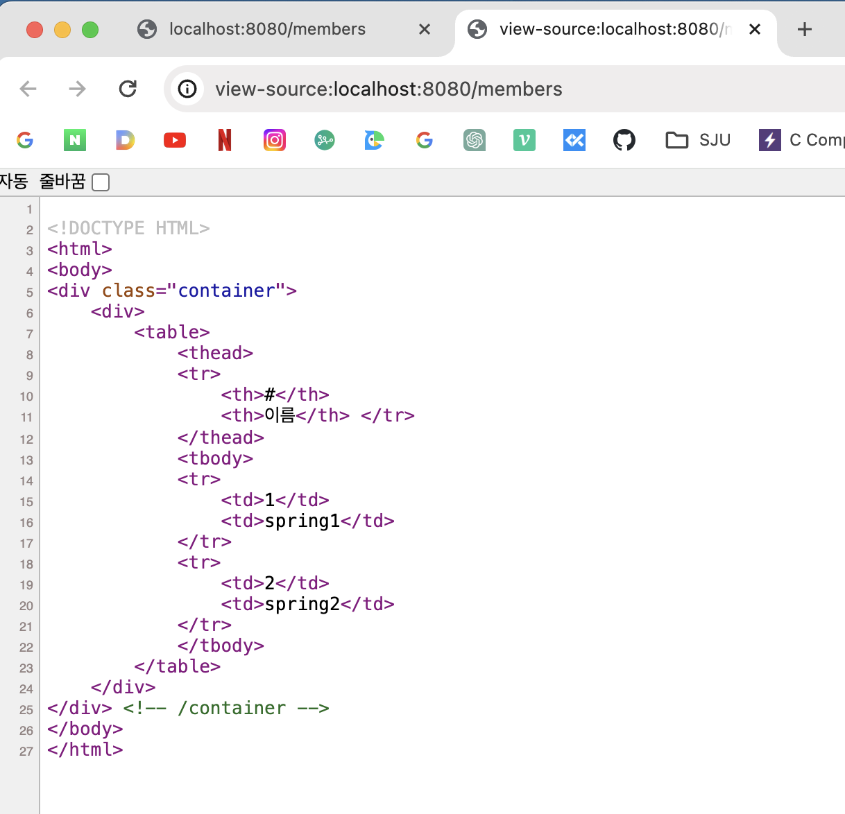 위 소스를 보면 tr태그 부분에서 thymeleaf 템플릿 엔진이 렌더링 한 결과를 볼 수 있다.