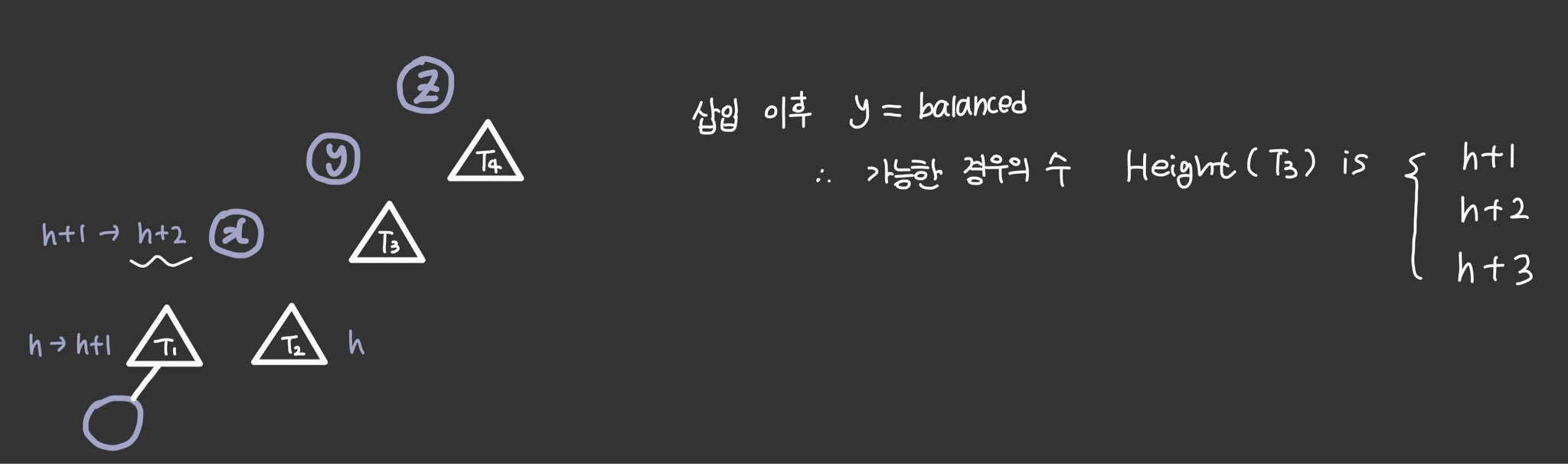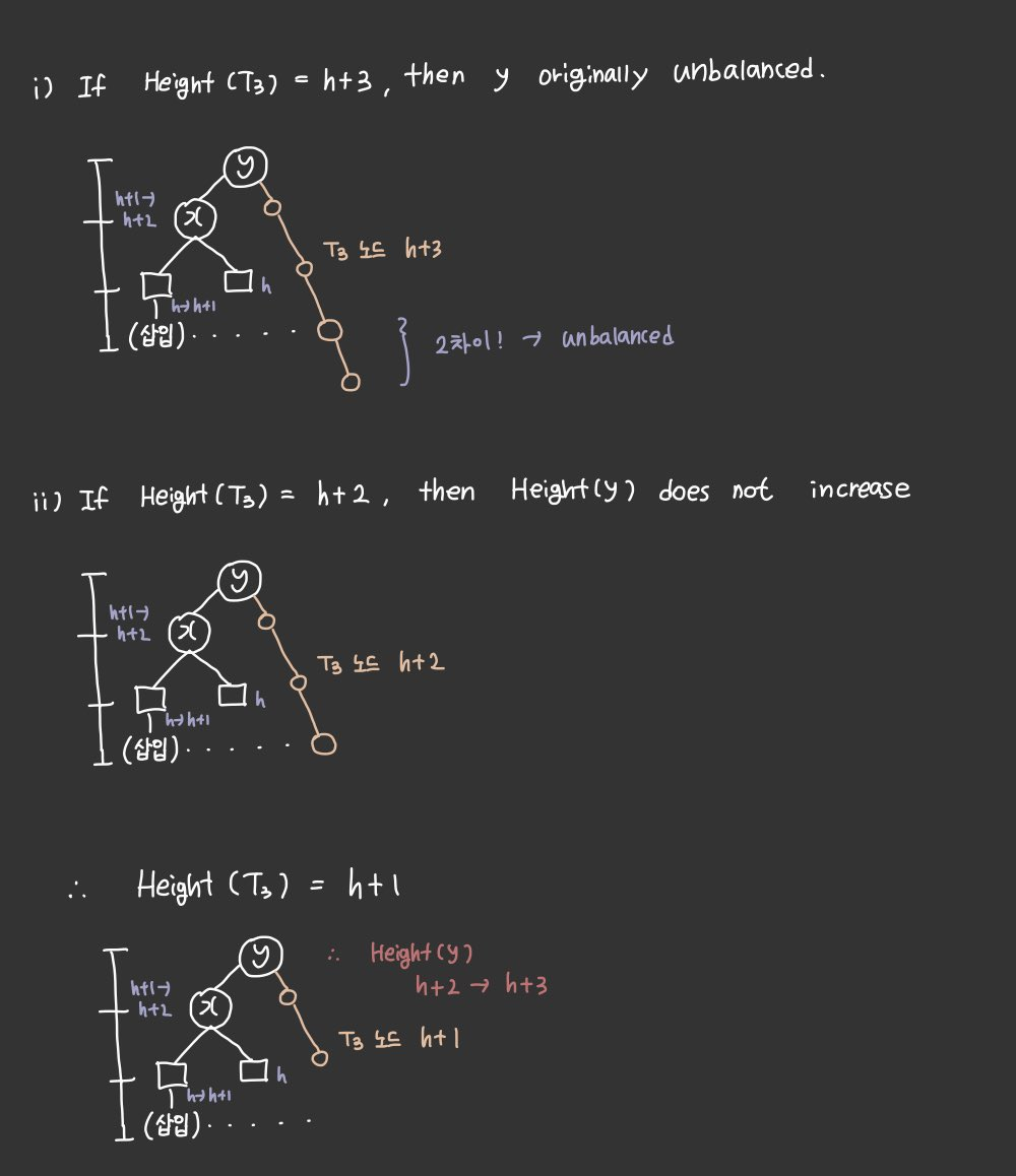 h + 2인 경우, originally unbalanced라서 제끼고, h + 1인 경우, 인자를 삽입해도 높이에 변화가 없기 때문에 제낀다. 그러면 T3의 높이는 h이다.