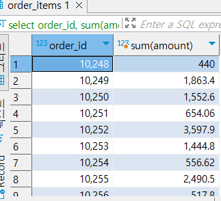 select order_id , sum(amount) as amount_sum_order_id, count(*) -- order_id의 갯수를 셈