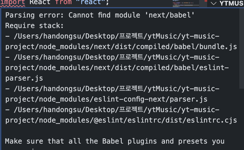 roadmaker react -> next 전환하기 위해 프로젝트 세팅 중 const 부분에서 'Parsing error : Cannot find module 'next/babel' 라는 에러가 발생했다.