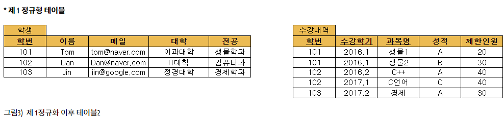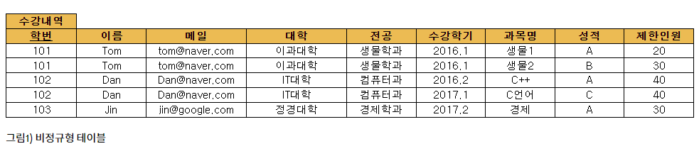 - 업무에서 관리하고자 하는 데이터(속성)를 함수 종속으로 도출한 결과 집합