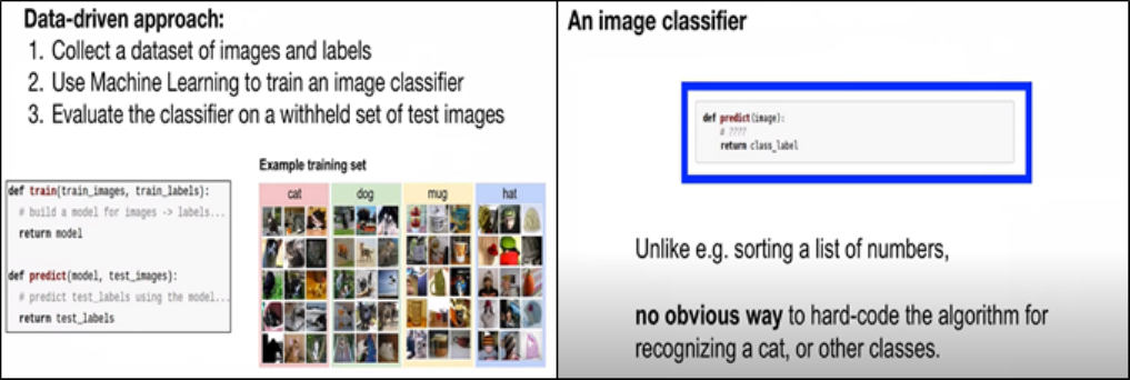숫자를 정렬해주는 알고리즘과 다르게 고양이 같은 클래스로 인식하는데 있어서 명백한 알고리즘이 존재하지않음.