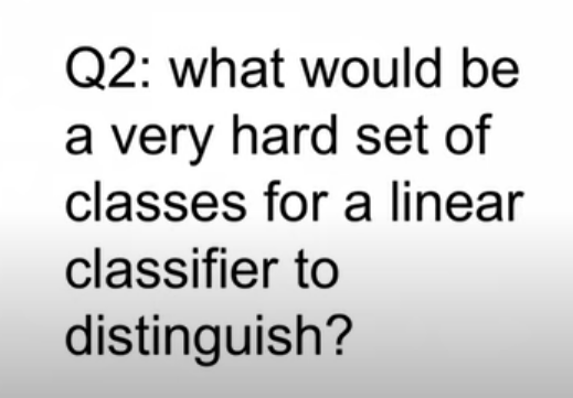 q2. what would be a very hard set of classes for a linear classifier to distinguish?