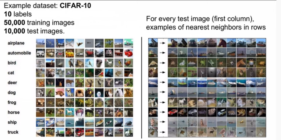 왼쪽열에 테스트 이미지 -> nnc에서 오른쪽 열에 10개의 근접한 이미지를 보여줌