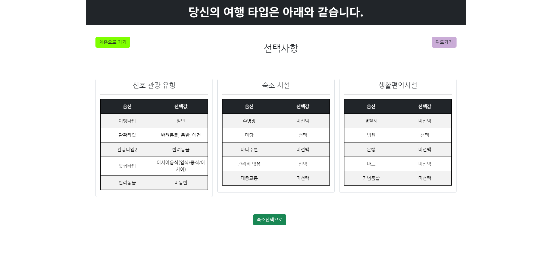 b. back-end - 선호 결과 db / 숙소 db / 관광 정보 db 를 통해 정보제공 / 지도 시각화 -> info_views