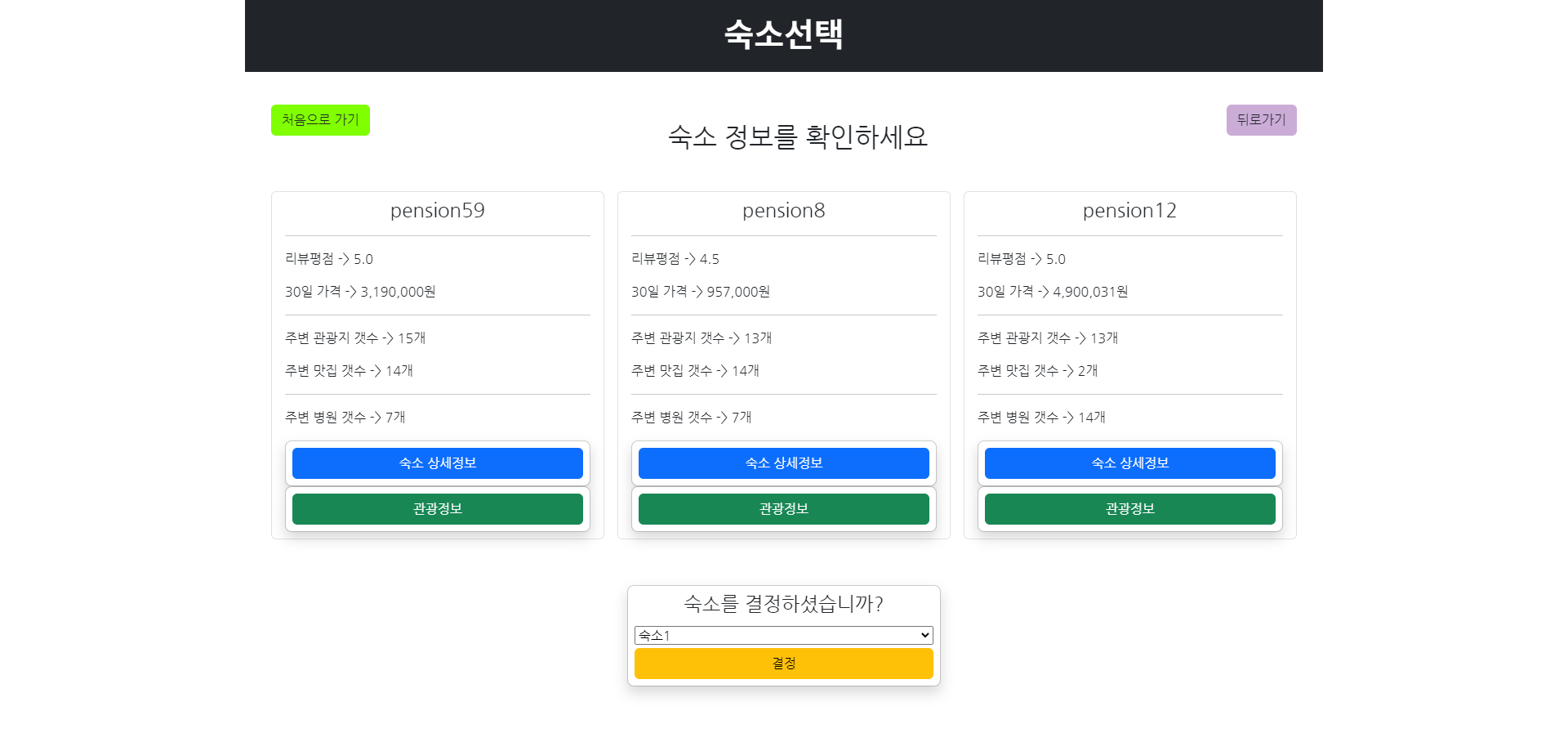 b. back-end - 선호 결과 db / 숙소 db / 편의시설 정보 db 를 통해 정보제공 / 지도 시각화 -> select_pension_views