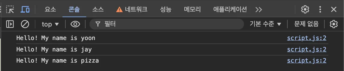 서로 다른 Argument(인자, 여기선 이름)을 parameter(매개변수)로 함수에게 전달