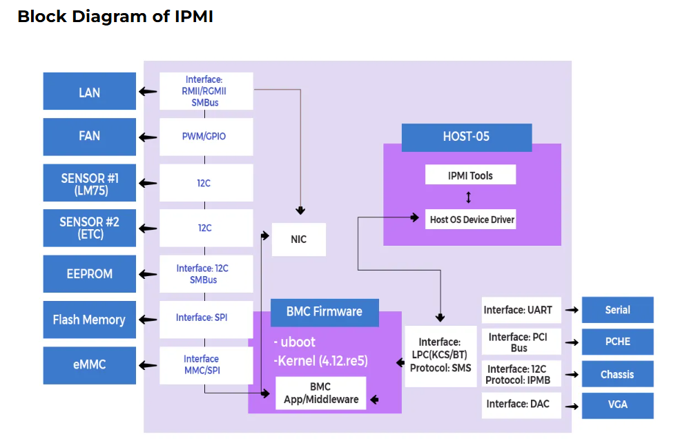 BMC는 서버 마더보드에 통합되어 있으며 전용 관리 버스를 통해 다른 구성 요소와 통신한다.