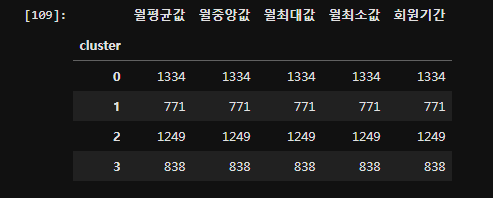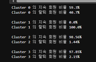 print(f'Cluster {str(i)} 의 탈퇴 회원 비율 {str(round((new_df.loc[(temp&delete1), 'customer_id'].sum() / new_df.loc[(temp), 'customer_id'].sum()) * 100,2))}%')