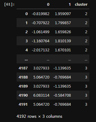 | KMeans | 중심점을 기준으로 데이터를 k개의 그룹으로 분할 | 빠르고 간단하지만 클러스터 수(k)를 사전에 지정해야 함 |