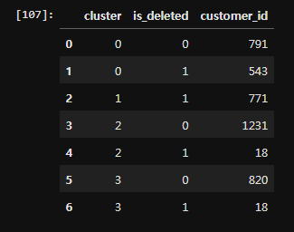 new_df = cc_join.groupby(['cluster','is_deleted'], as_index = False).count()[['cluster', 'is_deleted', 'customer_id']]