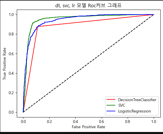 plt.title('dt, svc, lr 모델 Roc커브 그래프')