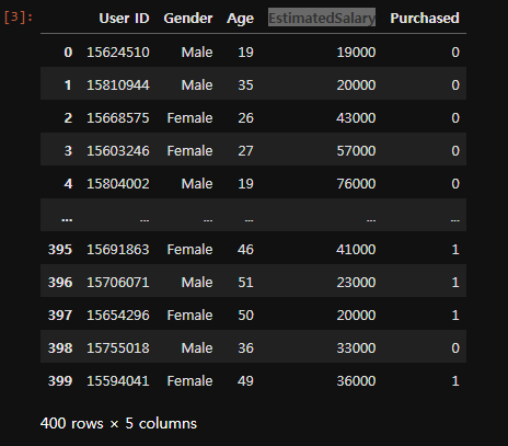 X = df.loc[:, 'Age':'EstimatedSalary'] # train_data