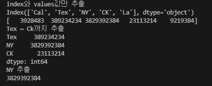 - 만약 Series를 만들 때 인덱스를 따로 지정 안했다면 기본적으로 0부터 시작하는 정수값이 인덱싱 됨