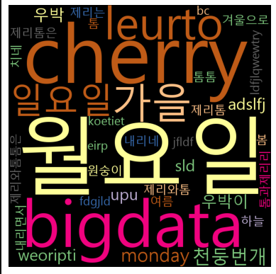 wc = WordCloud(stopwords=stopwords, width = 800, height = 800 ,font_path='c:/windows/Fonts/malgun.ttf', colormap= 'Accent_r',background_color='black')