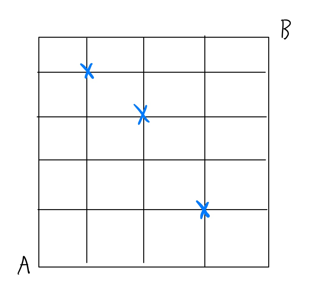위의 사진같은 A에서 B를 가는 경로의 수를 구하는 문제를 풀어본 경험이 있을텐데 갈수 있는 경로의 수를 써가며 더해가능 방식으로 해결을 하였는데 그러한 방식을 이 문제에도 그대로 적용하여 해결하면된다.